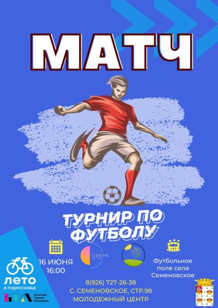 ⚽️Молодежный центр «Семеновский» Комплексного молодежного центра «Сфера» приглашает всех желающих на турнир по футболу «Матч», который состоится 16 июня на футбольном поле села Семеновское. 🥅Начало турнира в 16:00 📞89267272638📍Дмитровский г/о., село Семеновское, строение 98А