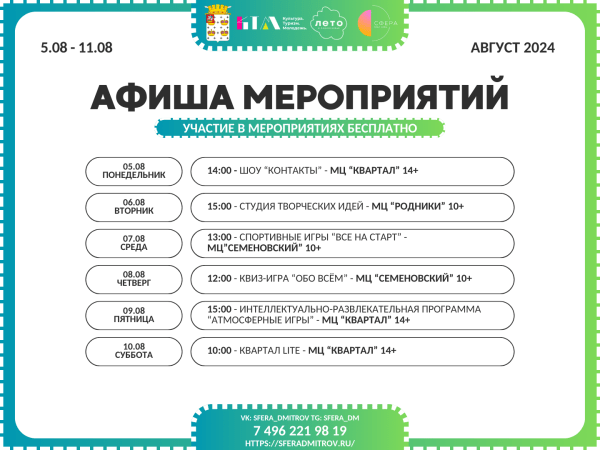Лето продолжается! С 5 по 10 августа у Комплексного молодёжного центра «Сфера» для тебя масса захватывающих мероприятий, которые никого не оставят равнодушным!