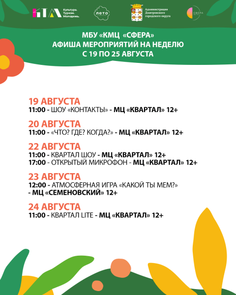 Еженедельная афиша мероприятий С 19 по 24 августа Комплексный молодёжный центр «Сфера» подготовил череду новых мероприятий на любой вкус!