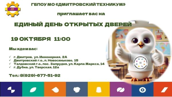 19 октября в 11 часов во всех структурных подразделениях Дмитровского техникума пройдет День открытых дверей.
