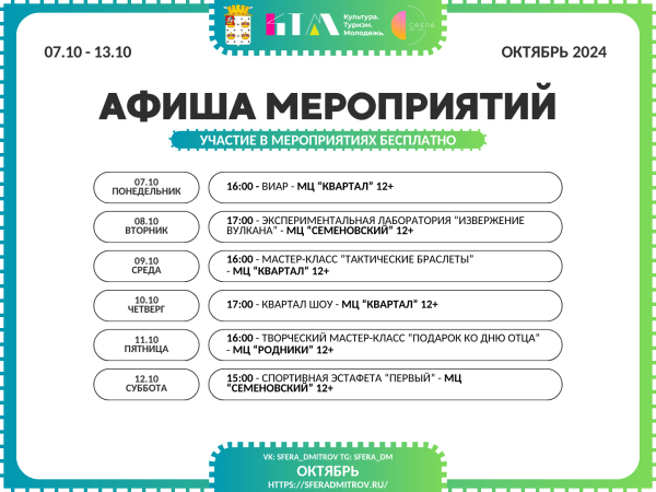 С 7 по 13 октября — новая неделя увлекательных мероприятий от Комплексного молодёжного центра «Сфера». Лови увлекательную программу на любой вкус!