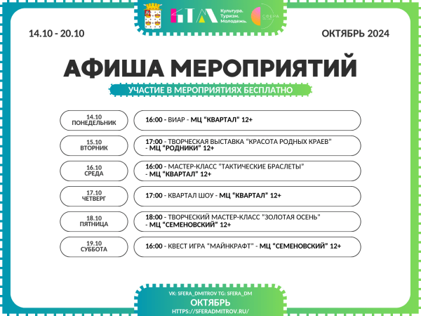 С 14 по 19 октября стартует новая неделя увлекательных мероприятий от Комплексного молодежного центра «Сфера».