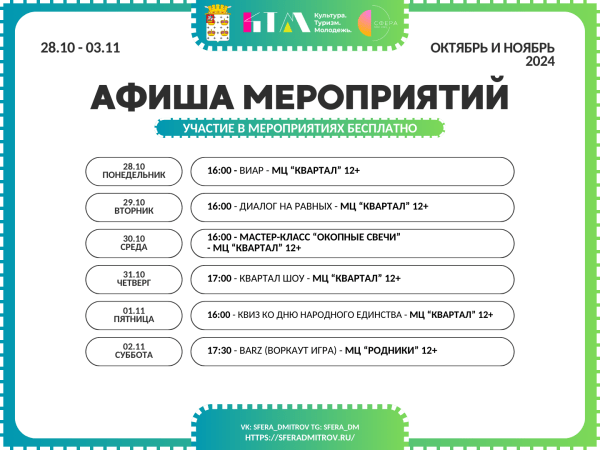 С 28 октября по 2 ноября Комплексный молодёжный центр «Сфера» подготовил череду новых мероприятий на любой вкус. Не упустите возможность провести эту неделю ярко и насыщенно!