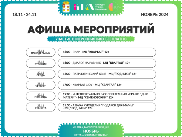 С 18 по 24 ноября Комплексный молодёжный центр «Сфера» подготовил череду новых мероприятий на любой вкус. Не упустите возможность провести эту неделю ярко и насыщенно!