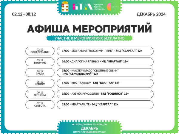 Со 2 по 8 декабря Комплексный молодёжный центр «Сфера» приглашает тебя на крутую серию мероприятий! Обязательно приходи с друзьями — будет невероятно интересно!