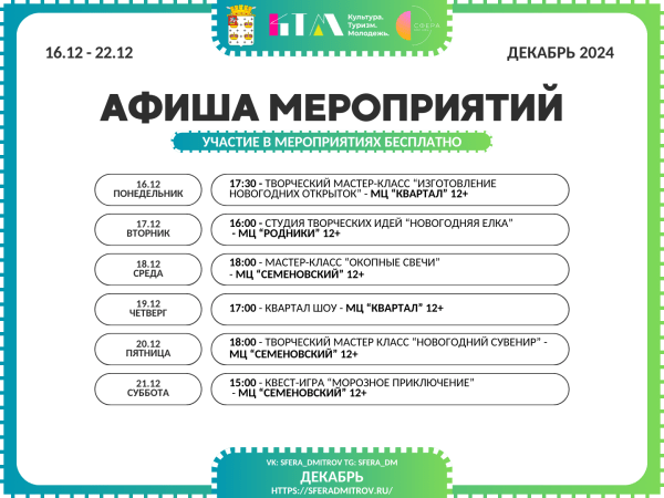Со 16 по 22 декабря Комплексный молодёжный центр «Сфера» приглашает тебя на крутую серию мероприятий! Будет очень интересно!