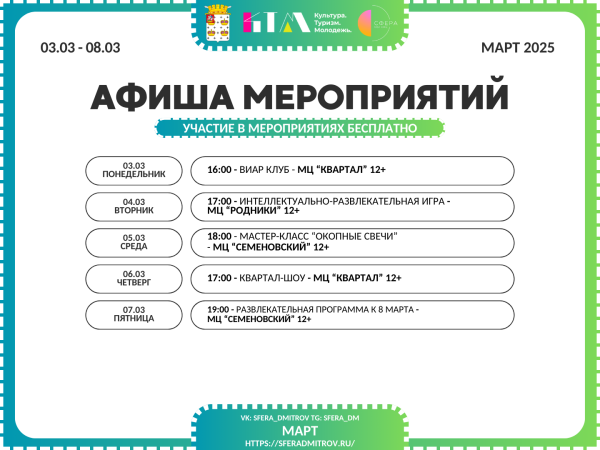 С 3 по 8 марта Комплексный молодёжный центр «Сфера» приглашает тебя на крутую серию мероприятий! Будет очень интересно!
