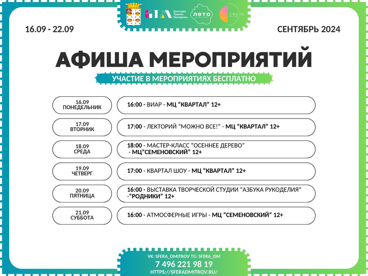 🟠 С 16 по 22 сентября Комплексный молодёжный центр «Сфера» подготовил череду новых мероприятий на любой вкус!