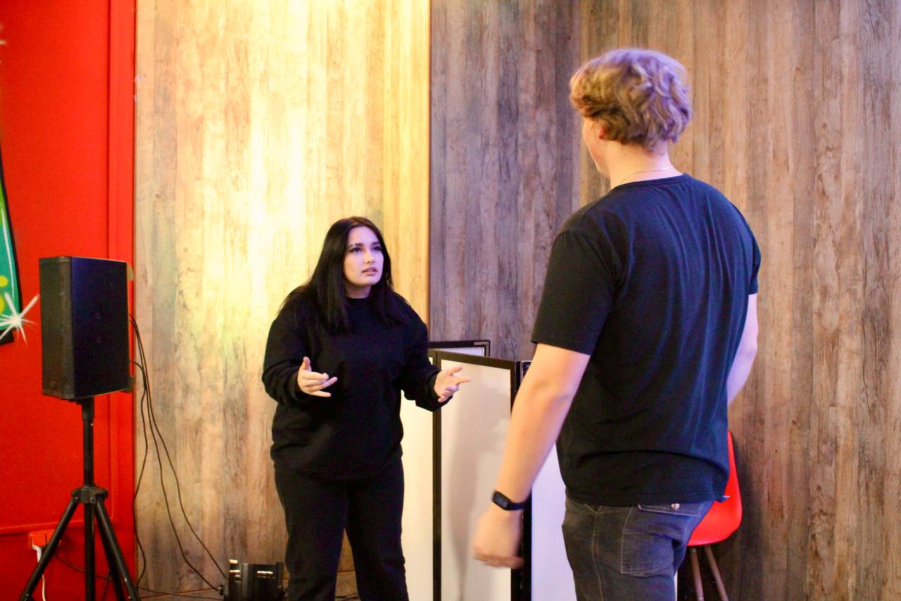Два человека играют сценку жестами, другие участники их озвучивают.