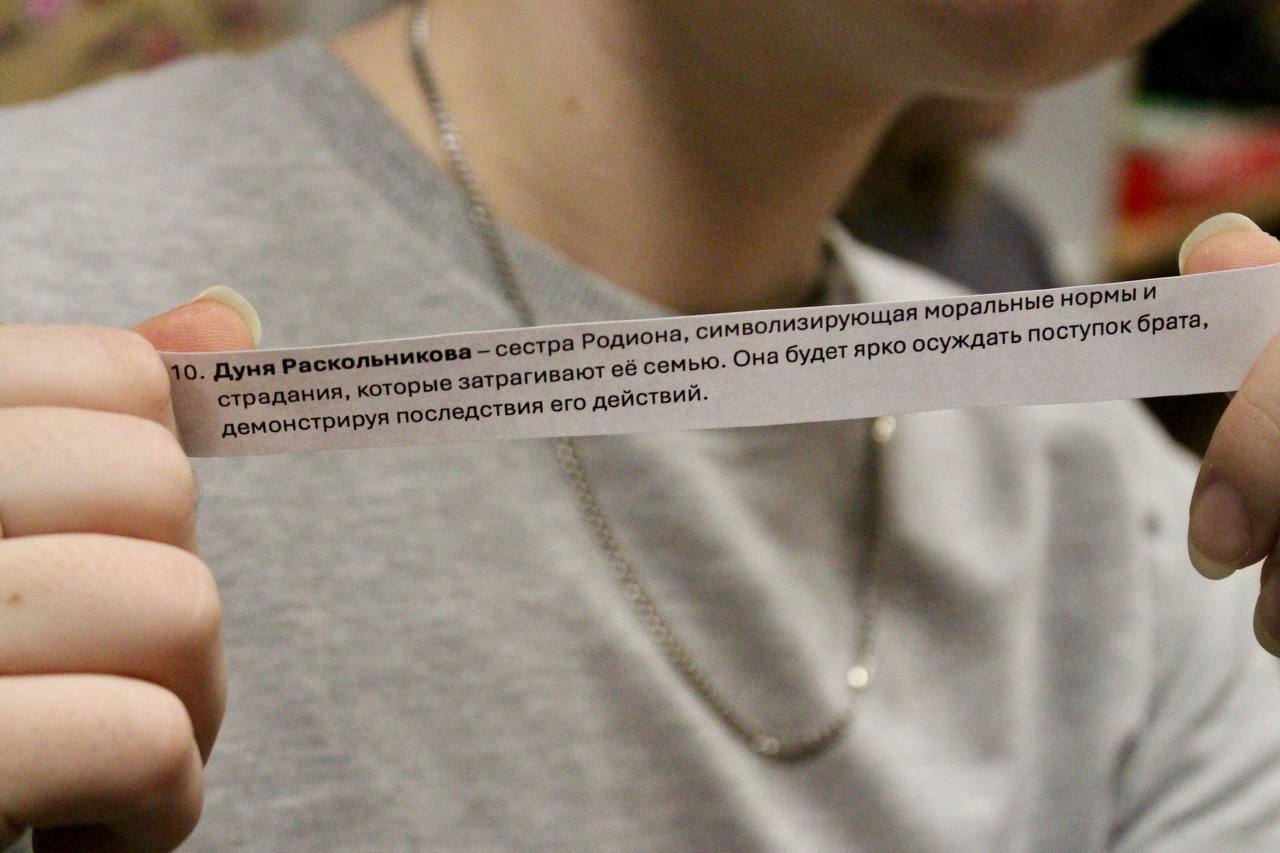 🪓 В центре внимания оказался Родион Раскольников, чьи идеи и внутренние терзания вызывали у присутствующих широкий спектр эмоций от поддержки до осуждения. Один из участников взял на себя роль Раскольникова, а остальные разделились на различные роли – психологов, философов и близких к нему людей. Такой подход добавил динамики в обсуждение.