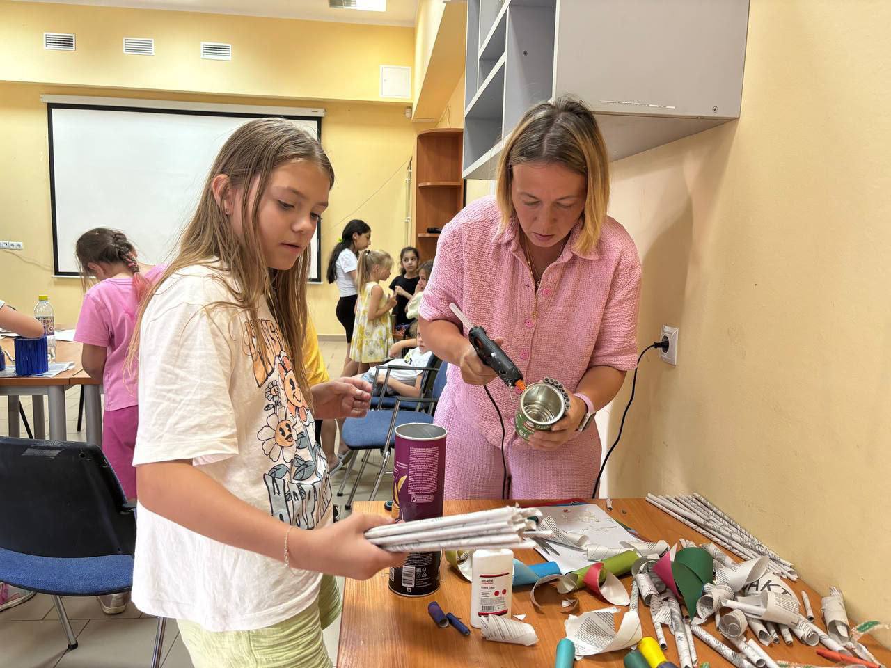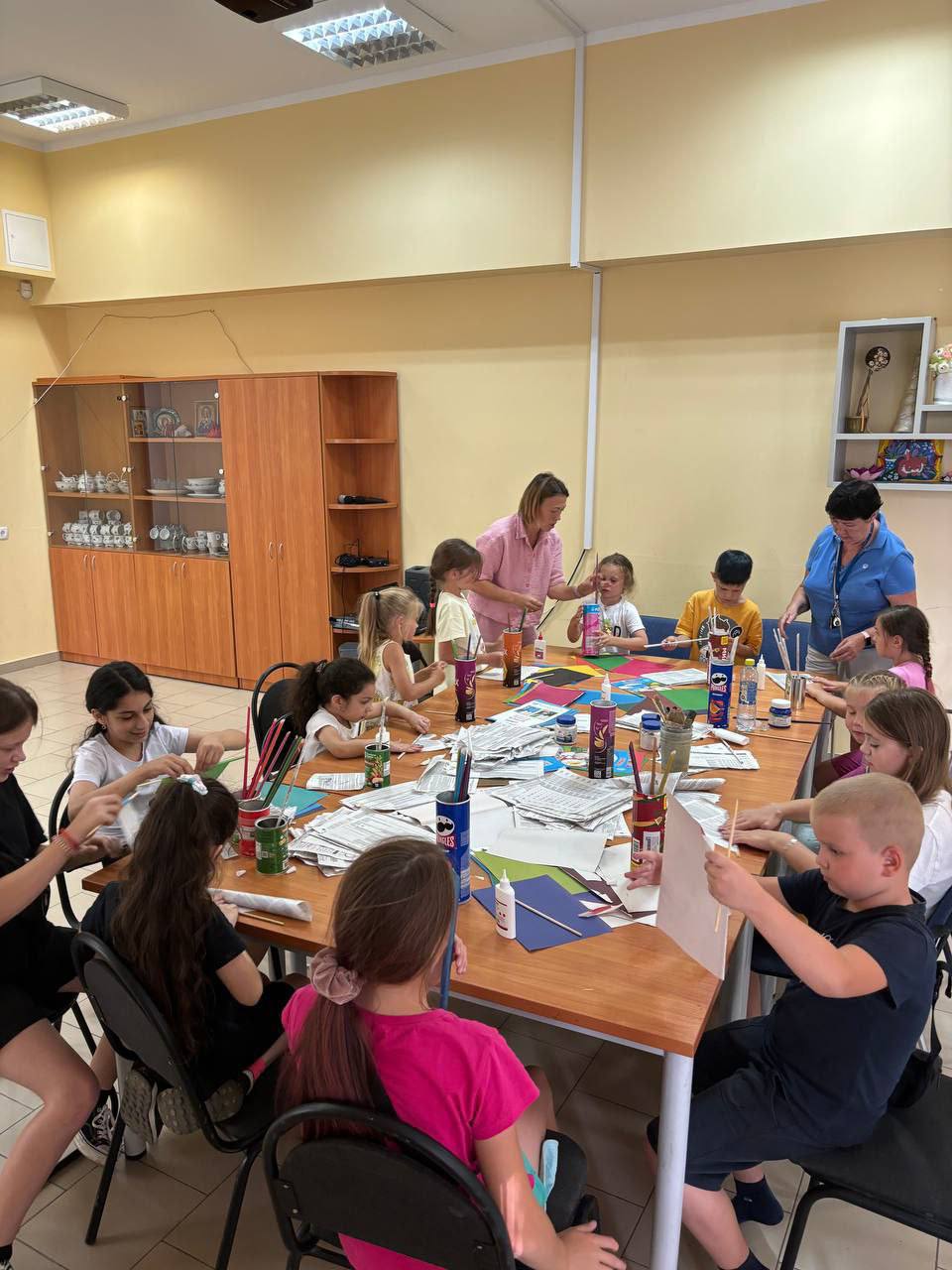 🗞️ На занятии участники создали оригинальные подставки для канцелярии, используя газетные трубочки. За основу взяли банки от чипсов, а из цветной бумаги и газет скрутили трубочки при помощи палочки. Далее банки украсили этими трубочками и раскрасили краской.