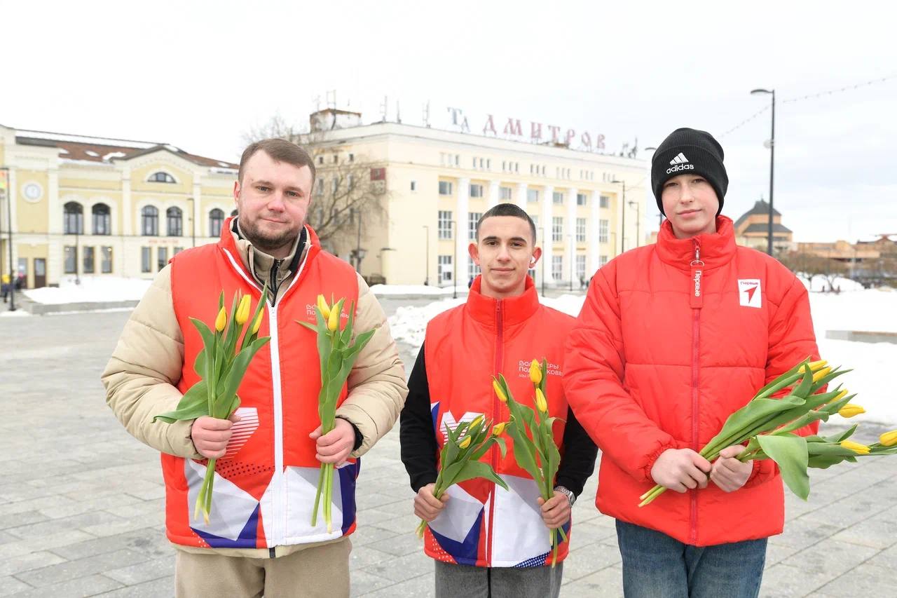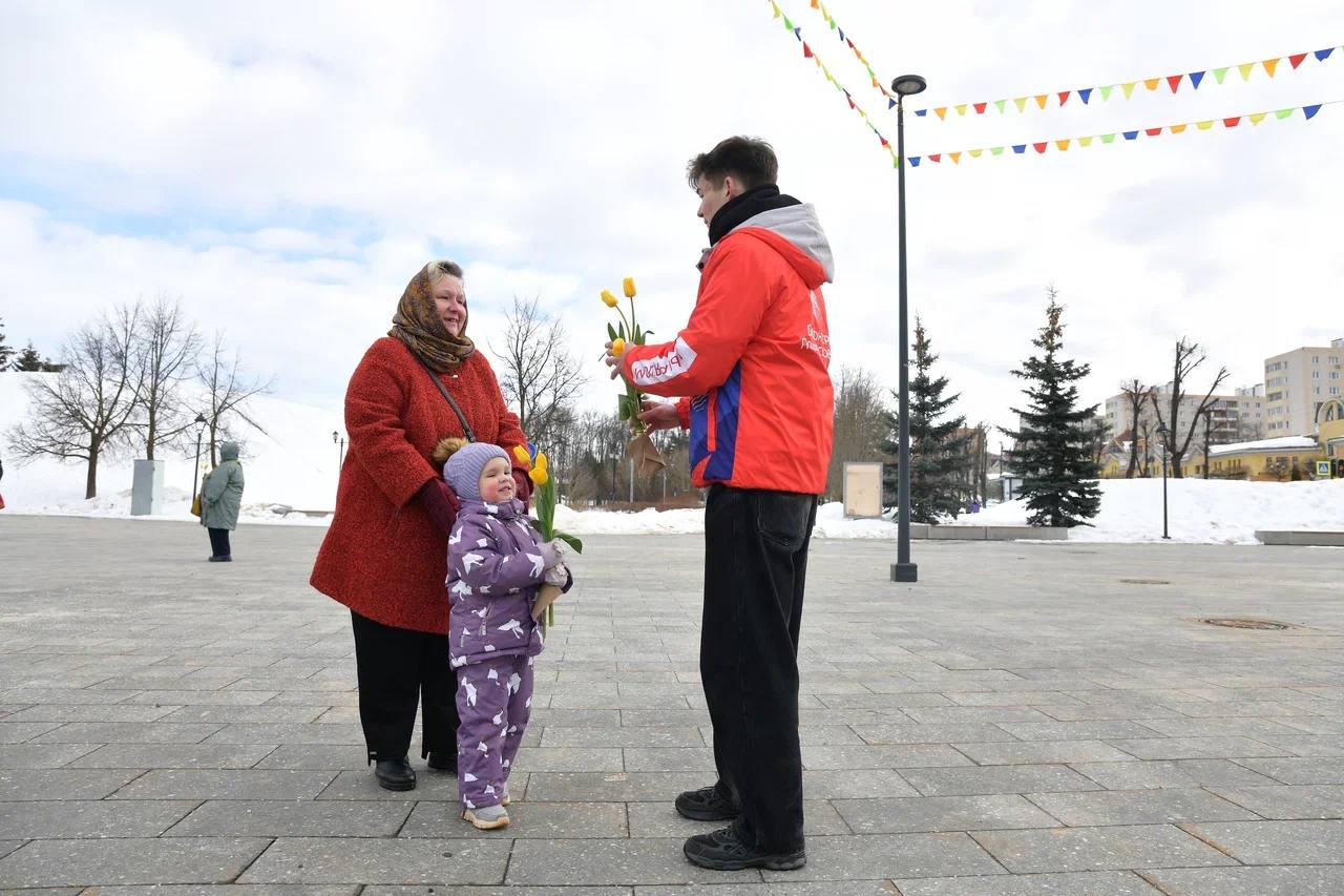 💐 Яркие цветы, тёплые улыбки и самые добрые слова в адрес наших прекрасных женщин, девушек и молодых семей дарили Волонтёры Подмосковья и участники Движения Первых на улицах Дмитрова.