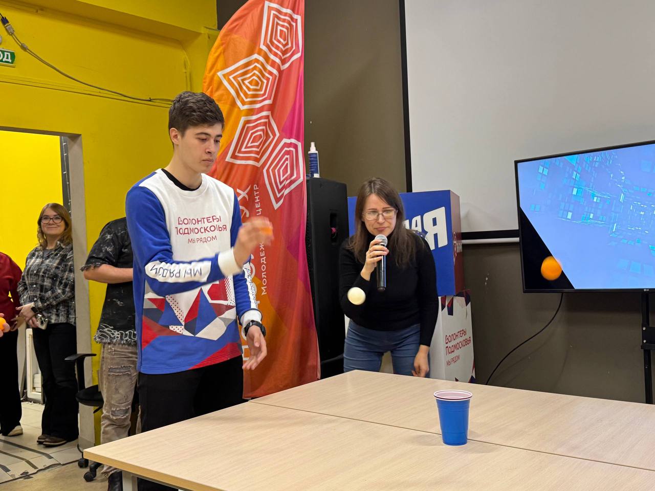 — «Попади первым» — шариком для пинг-понга необходимо было попасть в стакан, размещённый в центре стола;