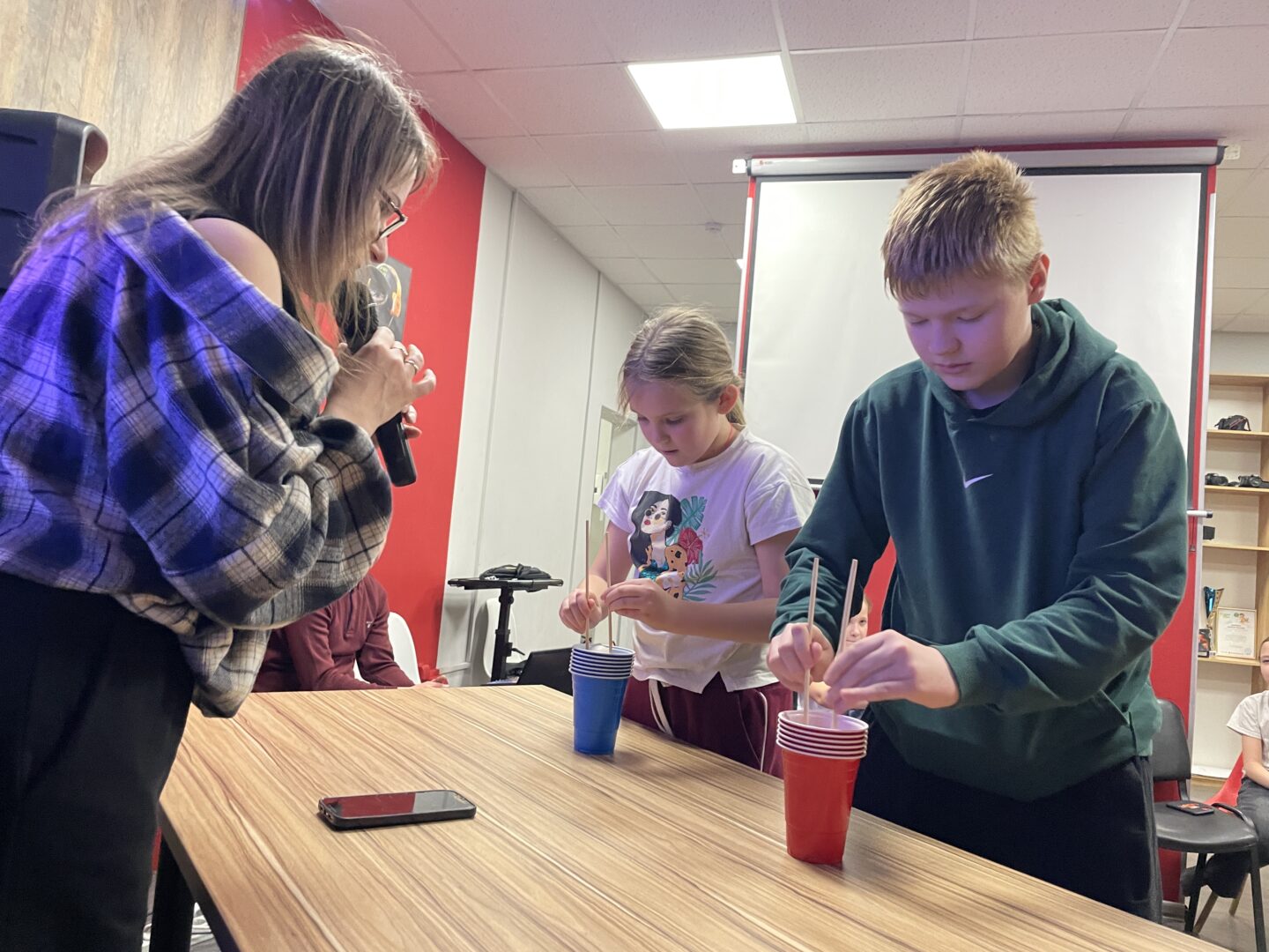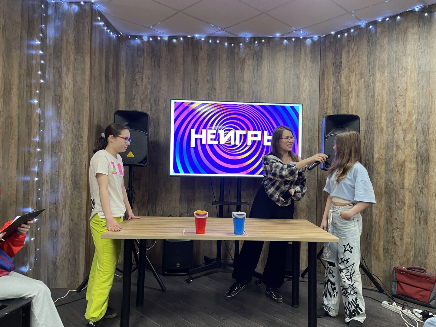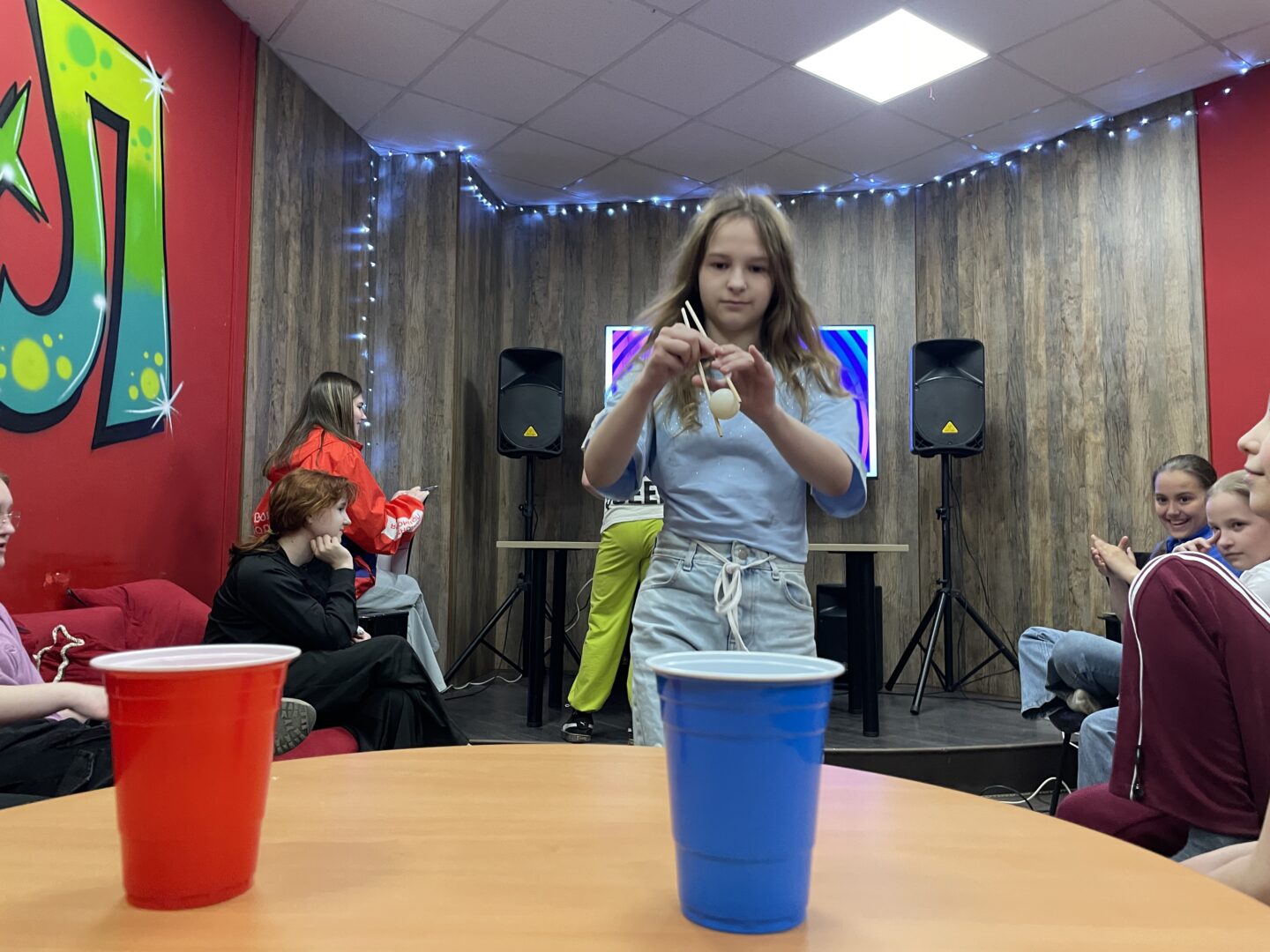 ✨ В первом испытании, под названием «Япония», нужно было с помощью палочек перенести мячик в стакан. Во втором раунде участники передавали шарики из одного стакана в другой, работая командой. В третьем — ловили шарики стаканом.