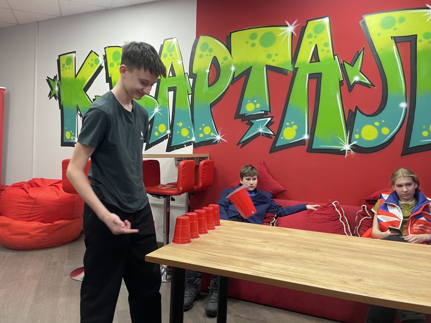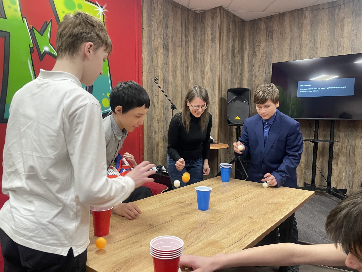 ⏱️ В первом раунде нужно было как можно быстрее перевернуть стаканы. Во втором — забросить мячи в ячейки, стараясь набрать максимум очков. В третьем — попасть мячиком в стакан. На протяжении всего времени, у ребят стояла задача выполнить все задания за одну минуту?