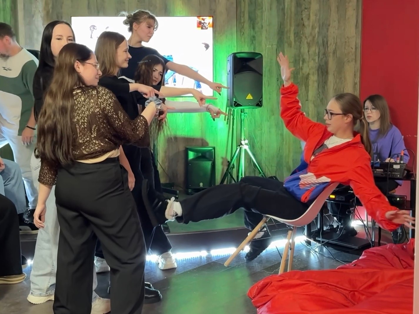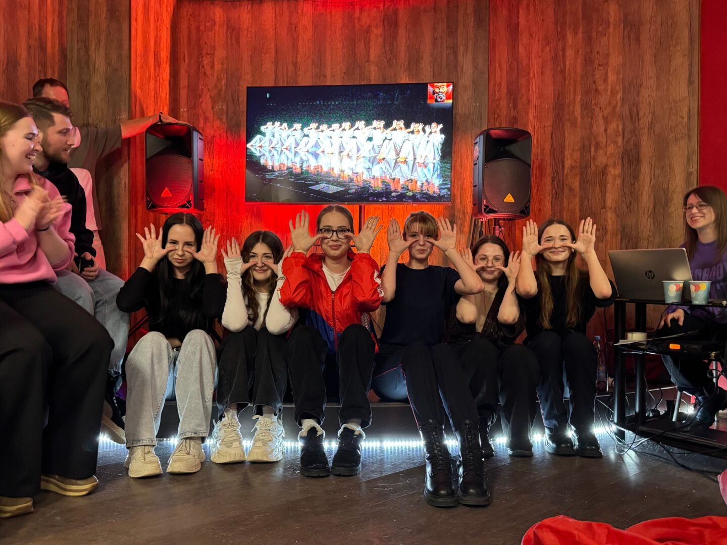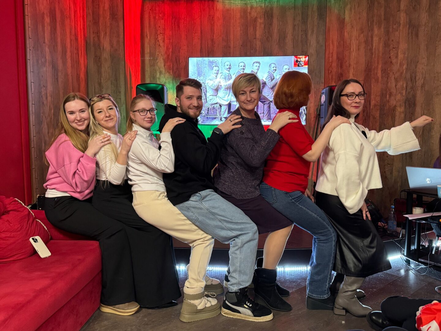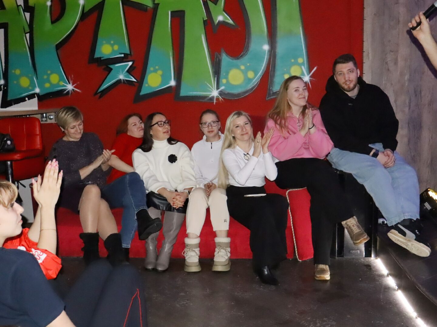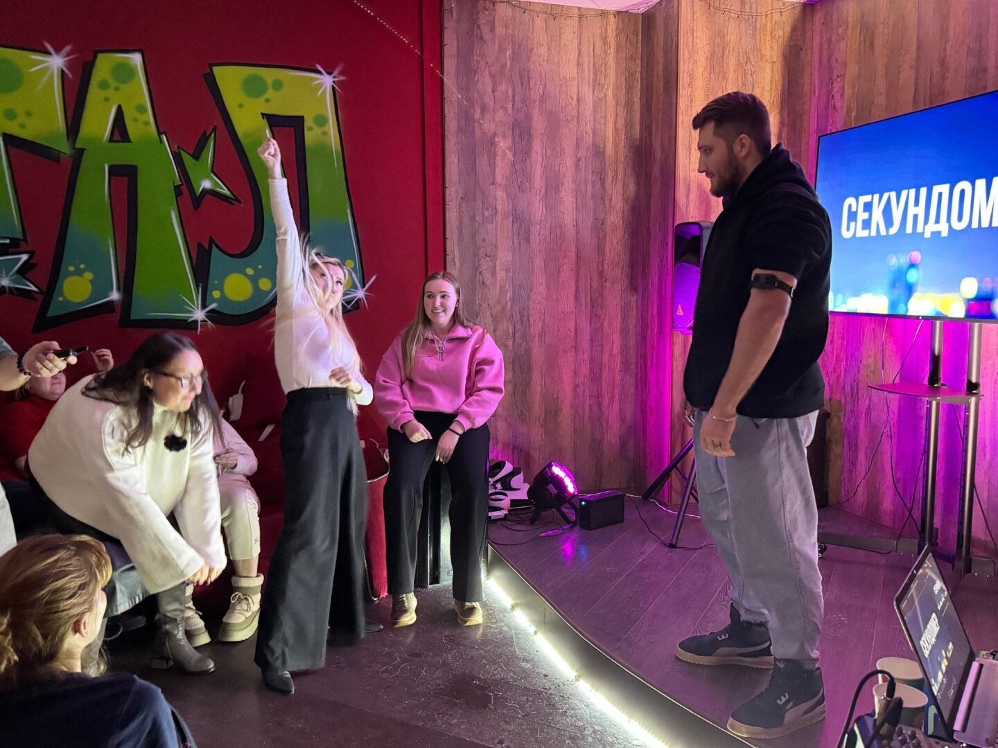 🎵 Участники угадывали оригинальные названия песен с заменёнными на синонимы словами, сдерживали смех в раунде с «мокрыми шутками», играли в крокодила с неожиданным поворотом, повторяли спрятанные фотографии и соревновались в музыкальном караоке.